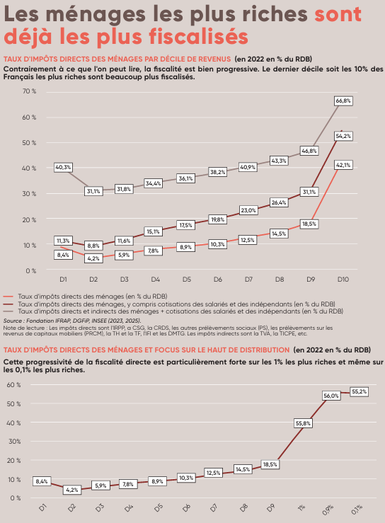 Si l’on retient uniquement les impositions directes (IR, CSG, IFI, etc.), le taux d’imposition du D10 atteint 42,1% soit 158,6 Md€, contre 8,4% pour le D1 (4,7 Md€). Ce taux monte à 54,2% sur le D10 si l’on y ajoute les cotisations des salariés et des indépendants contre 11,3% pour le D1. Enfin, si l'on ajoute encore les taxations indirectes sur les ménages, le taux d’imposition des 10% les plus riches atteint 66,8% contre 40,3% pour les 10% les plus modestes.