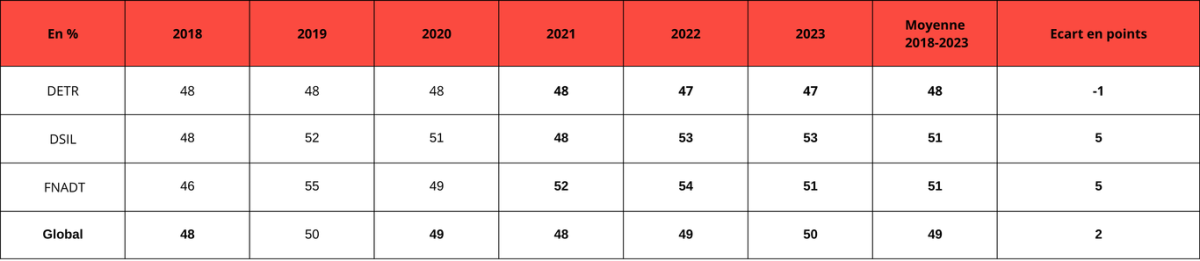 Sur la question de savoir si le programme TI a permis de prioriser et de concentrer les moyens des interventions publiques en faveur de l’industrie, la Cour relève que la plupart des dispositifs mis en place par les opérateurs le sont pour le compte de l’Etat (qui en assure totalement ou partiellement le financement) dans le cadre de leurs mandats de gestion. L’Etat intervient également en direct, mais aussi cofinance notamment les postes de chefs de projets (8 M€ entre 2018 et 2023) soit 54 dans 36% des territoires. Il agit également via les dotations aux collectivités territoriales (DGCL) au travers de la DETR (549 M€, de la DSIL (916 M€) et le FNADT (118 M€) en 2024. Globalement les territoires d’industrie ont bénéficié de moins de la moitié de ces montants jusqu’en 2023 (où l’on atteint enfin les 50%) :