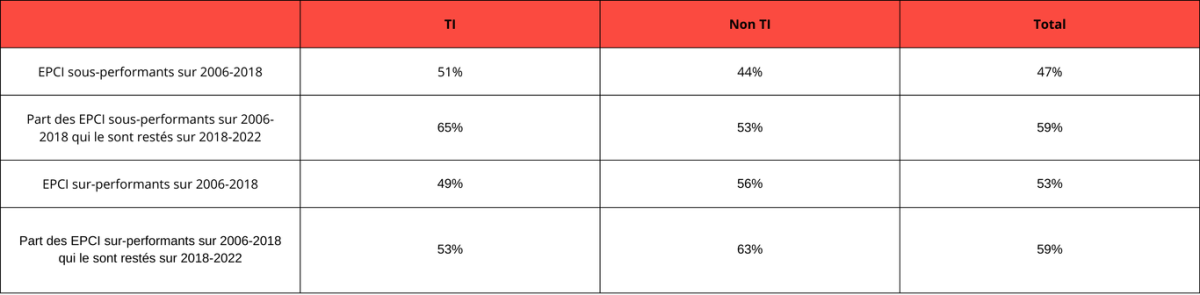 Les mêmes dynamiques sont à l’œuvre mais avec un effet plus réduit en cas de sur-performance. +4 points pour les territoires des EPCI en TI qui le sont restés contre +7 points pour les EPCI hors TI.