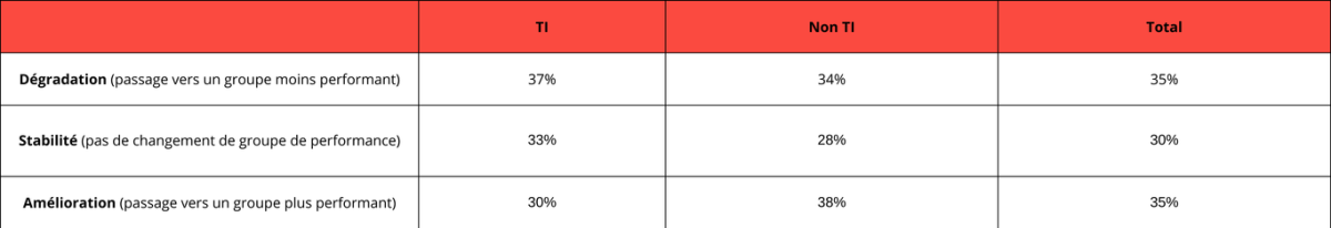 Le passage des emplois industriels à la maille de l’EPCI montrent un passage à un groupe moins performant dans 37% des cas pour les TI contre 34% hors TI, ils sont également plus nombreux à rester dans un groupe de même niveau de performance (33% contre 28 hors TI) et plus faibles à améliorer leurs performances (30% contre 38%).