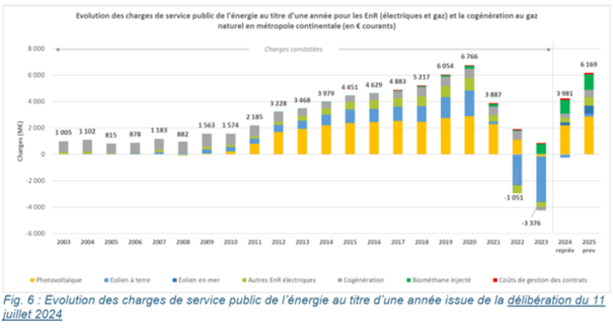 En 2025, les charges de service public de l'énergie (CSPE) liées aux EnR s'élèvent à environ 10,9 Md€, et les prévisions pour 2026 atteignent 12,9 Md€, en hausse de 2 Md€ selon la Commission de régulation de l'énergie (CRE) qui note que le soutien moyen par MWh EnR atteindra 92,42 € en 2026, en raison d’une baisse des prix de gros et d’une augmentation de la production dans un contexte déprimé de stagnation de la consommation (Délibération n°2025-180 page 9).