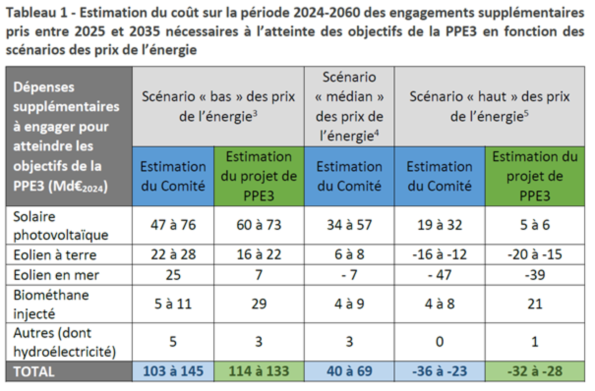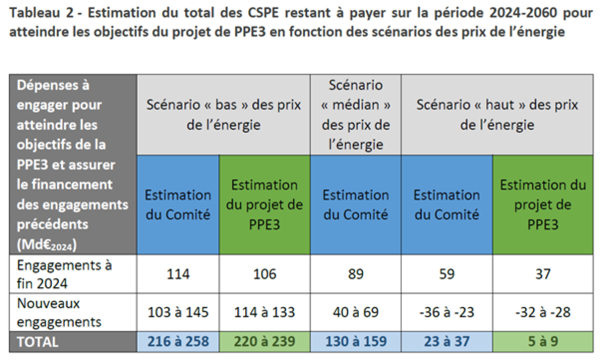 Engagements futurs : dans un scénario de prix bas (50 €/MWh), compatible avec les anticipations actuelles, les coûts cumulés des soutiens aux EnR pour la période 2024-2060 pourraient atteindre 216 à 258 Md€, dont une part significative liée à la PPE3-ancienne version (environ 100 Md€ pour les nouveaux projets). Voir l’avis du Comité de gestion des charges de service public de l’électricité sur le volet budgétaire de l’étude d’impact de la programmation pluriannuelle de l’Energie (2025-2030, 2031-2035) de métropole continentale.