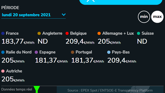 Sur les bourses européennes (EPEX SPOT, Nordpool, etc…), les fournisseurs négocient des quantités à terme principalement pour se protéger, les contrats à long terme étant généralement à prix maîtrisés, mais aussi des quantités spot. L’électricité spot provient de productions renouvelables intermittentes et de production par centrales à gaz. Une pratique qui a été très rentable ces dernières années, les prix y étant très bas, au point que des fournisseurs n’utilisaient pas leur quota de MWh « nucléaires » à 42€. Mais l’augmentation des prix sur les bourses dues depuis deux ans à l’augmentation du prix du gaz et à la fermeture de nombreuses centrales fossiles et nucléaires a changé la donne, notamment en 2021 comme on le voit entre les lundi 23 septembre 2019 et 20 septembre 2021.