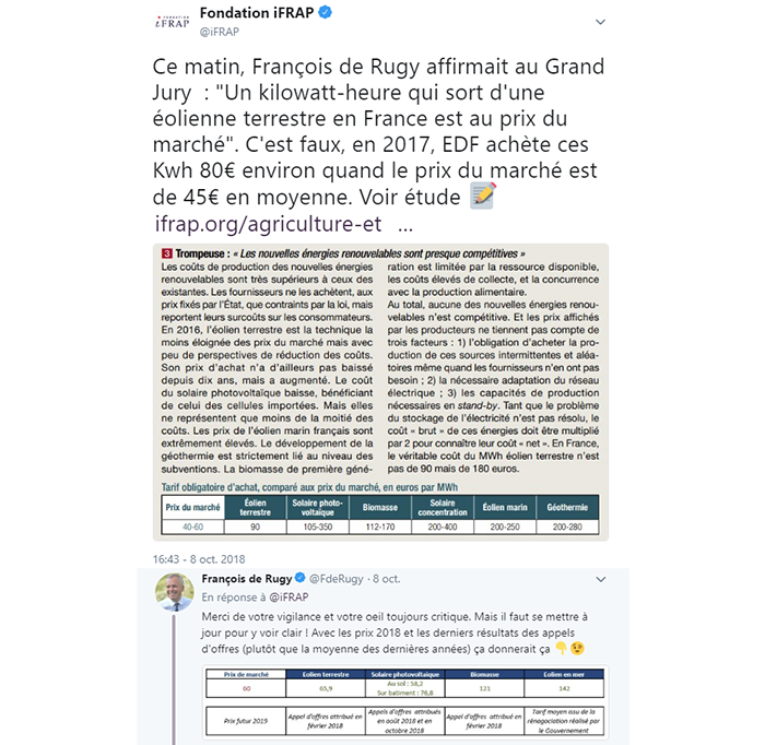 François de Rugy, ministre de l’Écologie et de l’Énergie, a déclaré au cours de l’émission Le grand Jury LCI-Le Figaro-RTL du 7 octobre qu' « un kilowattheure qui sort d'une éolienne terrestre en France est au prix du marché ». Une donnée que la Fondation iFRAP conteste car les divers mécanismes de subventions (prix garanti, obligation d'achat, complément de rémunération pendant 20 ans) sont précisément là pour combler un écart de 40 euros entre le prix moyen de 85 euros des megawattheure (Mwh) éoliens terrestres, et les 45 euros de la moyenne des prix sur l'année.