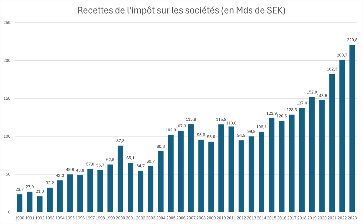 Certes, en parallèle de ces baisses de taux, la base taxable a été élargie (suppression de niches, durcissement des déductions, etc.), mais la pression fiscale sur les entreprises a tout de même largement diminué. Aujourd’hui, la Suède perçoit des recettes fiscales plus élevées que la France en pourcentage du PIB malgré son taux inférieur. Les recettes de l’IS en Suède représentent 3 % du PIB contre 2,5 % du PIB en France. En 1990, ce taux était de 1,5 % du PIB en Suède et de 2,2 % en France. Les Suédois ont donc réussi à doubler le rendement de leur impôt sur les sociétés depuis 1990 en baissant leur taux. Entre 1994 et 2023, les recettes de l’IS suédois ont explosé de 426 % en valeur nominale, et de 224 % en valeur réelle ! C’est une illustration concrète de l’effet Laffer.