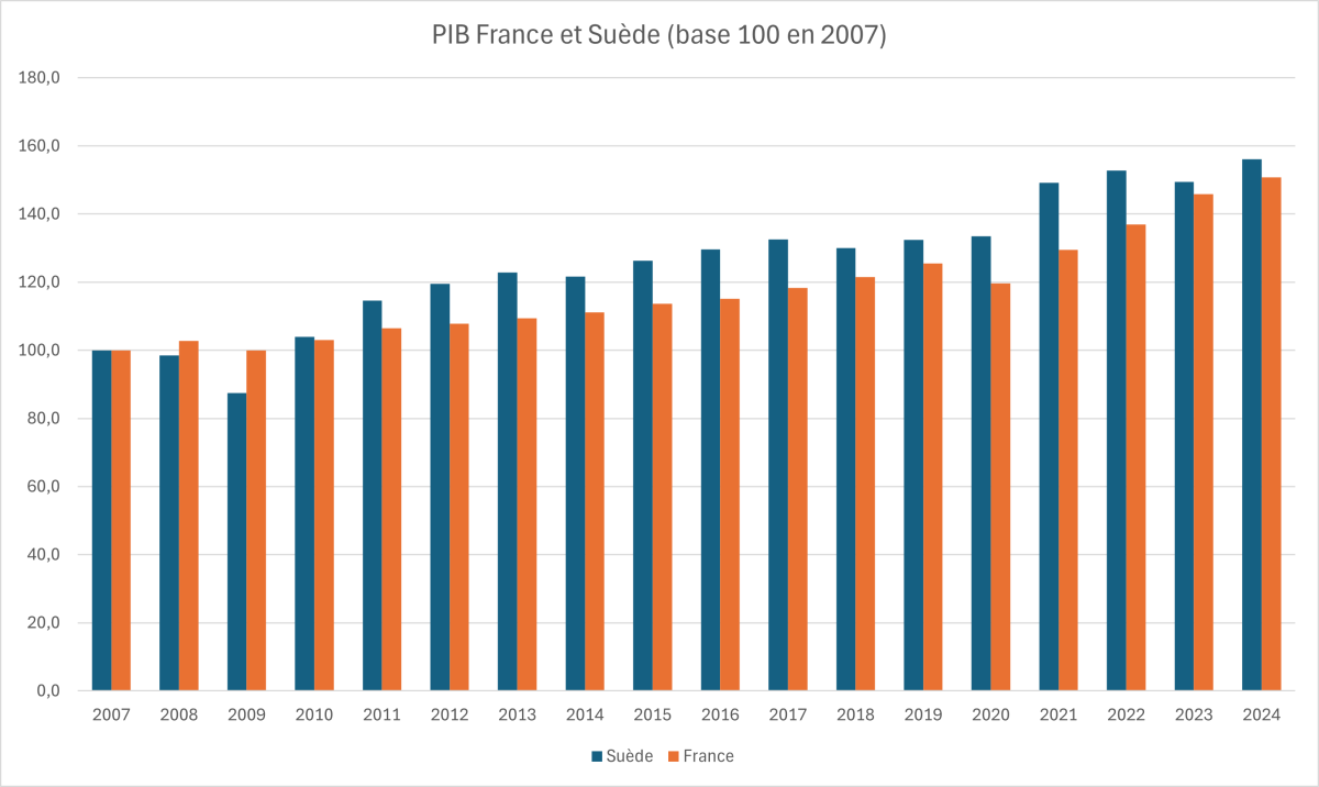 Cette hausse des recettes fiscales n’est pas due qu’à la baisse des impôts mais également à la flexibilisation et la libéralisation de l’économie qui ont permis de créer des conditions propices à la production. La flexibilisation du marché du travail a notamment permis de faire progresser le taux d’emploi. En 2024, le taux d’emploi suédois était de 76,7 %, soit 6 points au-dessus de la moyenne de l’UE (70,8 %), contre 69 % en France. La conséquence de ce taux d’emploi très élevé est la hausse du volume d’heures travaillées. En moyenne, les personnes âgées de 15 à 64 ans travaillent 1 190 heures par an en Suède, contre 1 105 heures en France alors que la durée annuelle moyenne du travail des personnes en emploi est de 1 595 heures en France et de 1 522 heures en Suède en 2024.