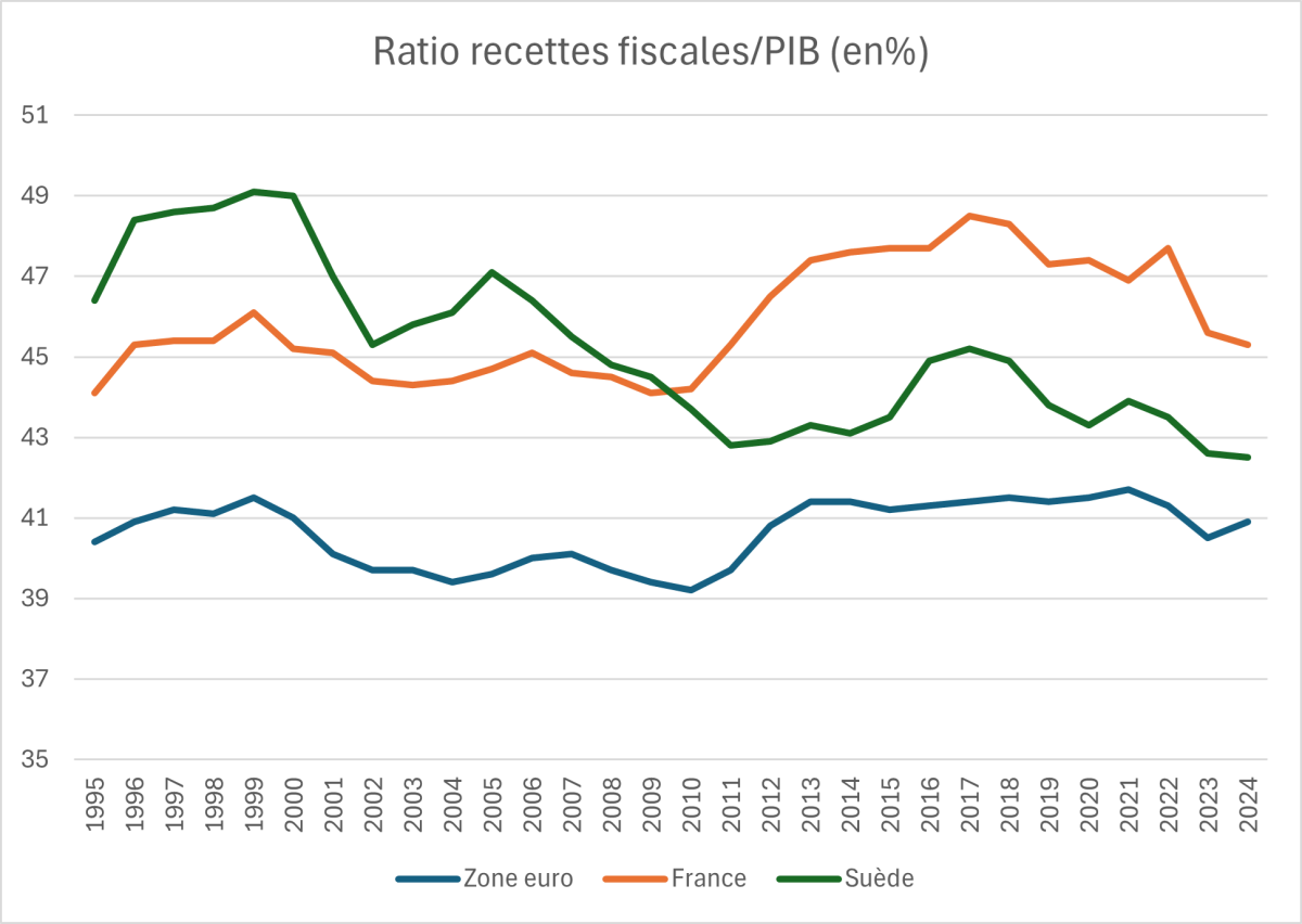 Malgré la hausse de la TVA et la création de la taxe généralisée sur les salaires, la pression fiscale est en nette baisse en Suède depuis 1995. Le ratio recettes fiscales/PIB passe de 46,4 % en 1995 à 42,5 % en 2024. L’écart avec la zone euro se resserre fortement : il était de 6 points en 1995 et n’est plus que de 1,6 point en 2024. La France, au contraire, s’éloigne de cette moyenne. L’écart avec la zone euro passe de 3,7 points en 1995 à 4,4 points en 2024 malgré la baisse de la pression fiscale depuis 2017.