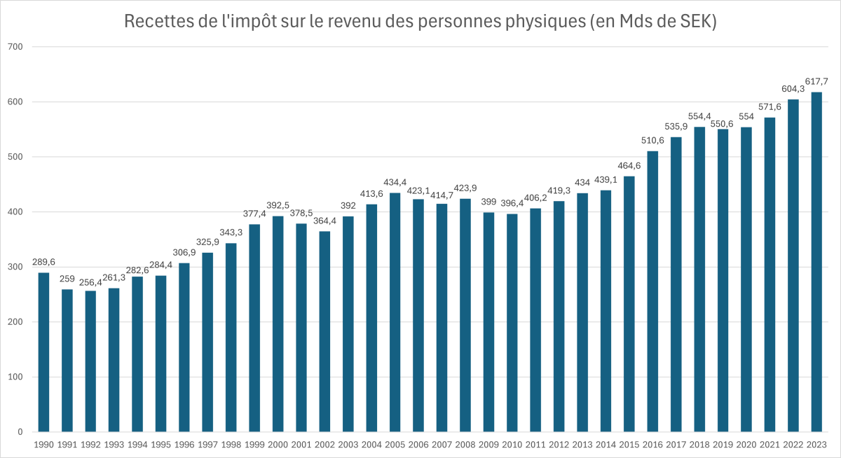 Cependant, une taxe généralisée sur les salaires a été créée au moment de l’adhésion de la Suède à l’UE (1995). Cette taxe sans contrepartie a été augmentée progressivement de 1,5 % lors de sa création à 11,62 % en 2023 et pèse fortement sur la fiscalité des revenus du travail.