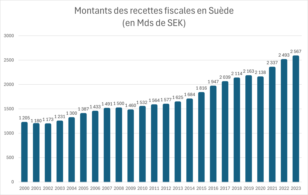 Pourtant, dans le même temps, le montant des recettes fiscales perçues par les administrations publiques a augmenté. Entre 2000 et 2023, les recettes fiscales suédoises ont ainsi progressé de 113 % en termes courants et de 38 % en termes constants. La baisse de la pression fiscale a donc permis d’augmenter les recettes grâce à la croissance qu'elle a générée : c’est l’effet Laffer.