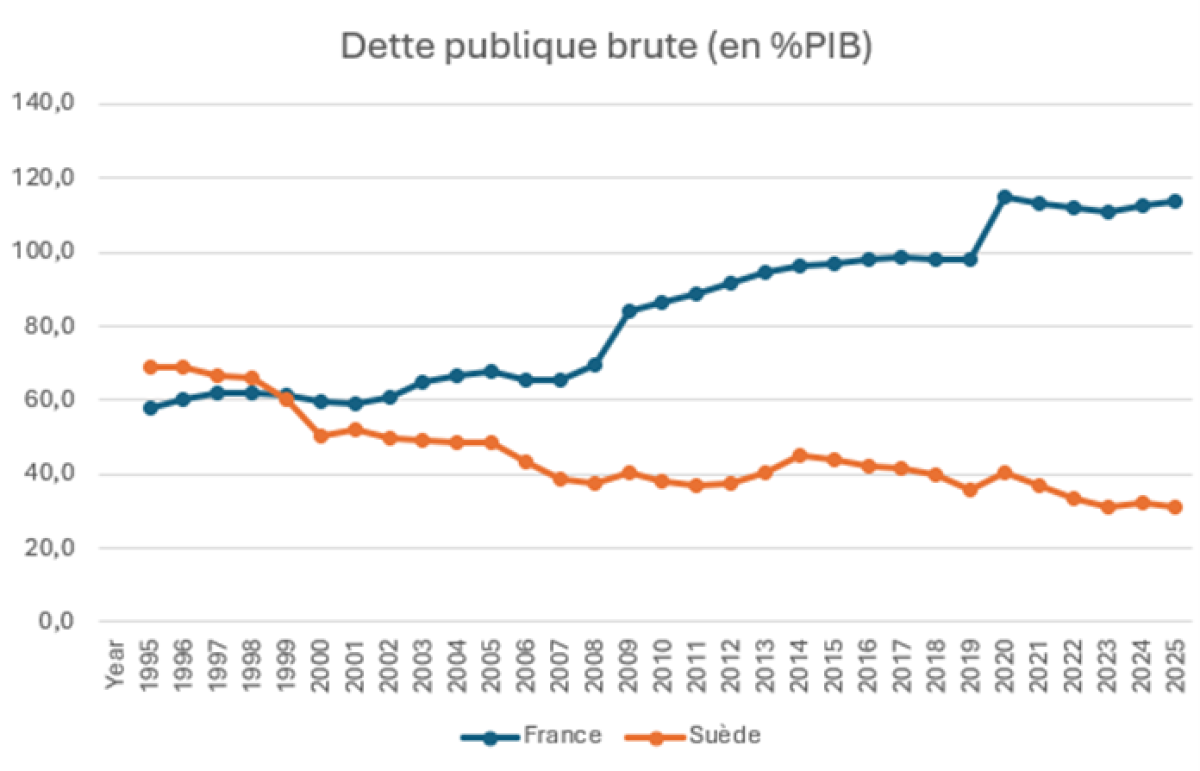 Les Suédois ont donc décidé d’utiliser trois leviers pour redresser leurs finances publiques : l’effet Laffer obtenu grâce à la baisse des impôts, la baisse de la dépense publique et la flexibilisation et la libéralisation de l’économie pour créer un environnement plus propice à la croissance économique. Ils ont pris le chemin inverse à celui emprunté par la France, qui a fait le choix de financer l’augmentation de la dépense publique par la hausse de la pression fiscale. Le résultat est clair : les finances publiques ont été maitrisées en Suède tandis que la dette a explosé en France. Le ratio dette/PIB a chuté de 68,8 % à 34 % entre 1995 et 2025 en Suède, et a progressé de 57,8 % à 115,6 % en France.