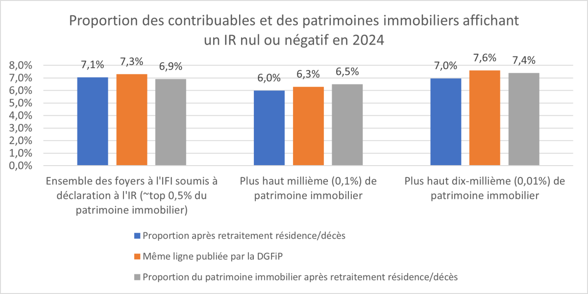 En tout cas ce que le tableau ci-dessus montre, c’est qu’entre le top 0,5 % des patrimoines immobiliers assujettis à l’IR et résidents (non décédés) en France, et sa décomposition en prenant le 0,1 % puis le 0,01 %, la proportion de foyers à impôt sur le revenu nul ou négatif est fixe ou quasi fixe, autour des 6,0 %-7,0 %, quelle que soit la focale. La DGFiP affiche une variation un peu plus accusée, mais on ne comprend pas bien comment cette variation est possible (à partir des données fournies). La proportion de leur patrimoine suit, entre 6,5 % et 7,4 %.