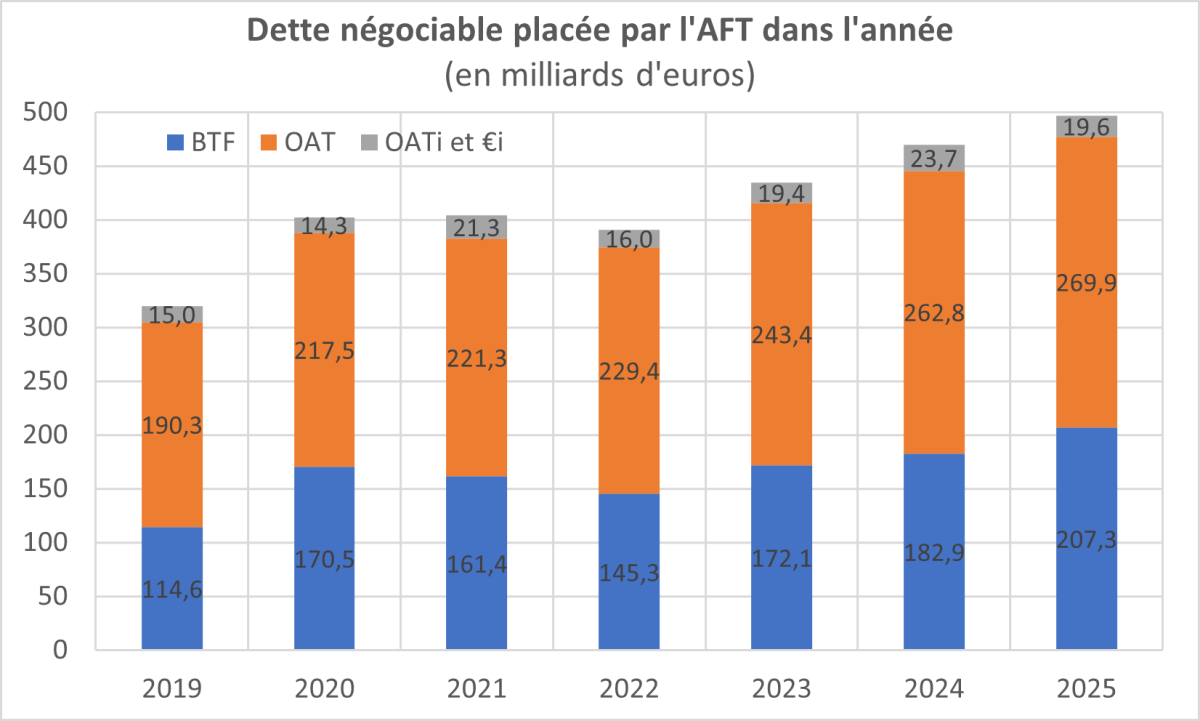 L’Agence France Trésor, qui gère une majeure partie de la dette négociable française, aura placé cette année 497 milliards d’euros de titre de dette : 207 milliards de BTF à court terme, 270 milliards d’euros d’OAT à moyen et long terme, 20 milliards d’euros d’OAT indexée sur l’inflation de la zone euro ou française.