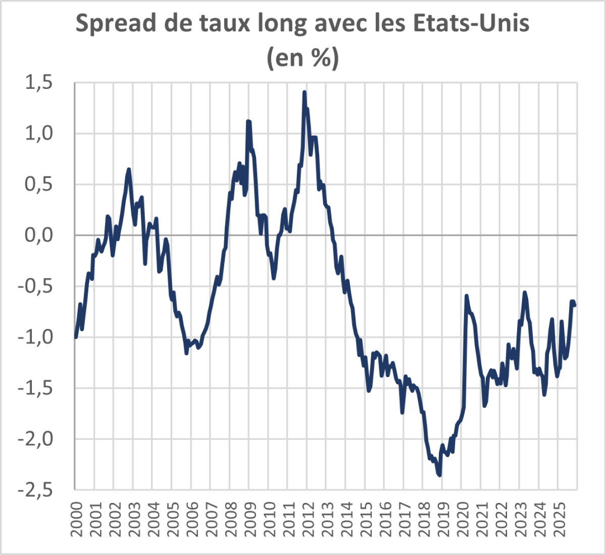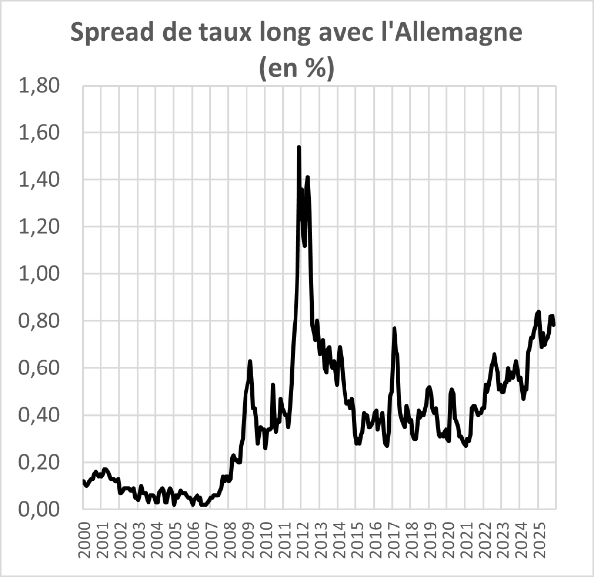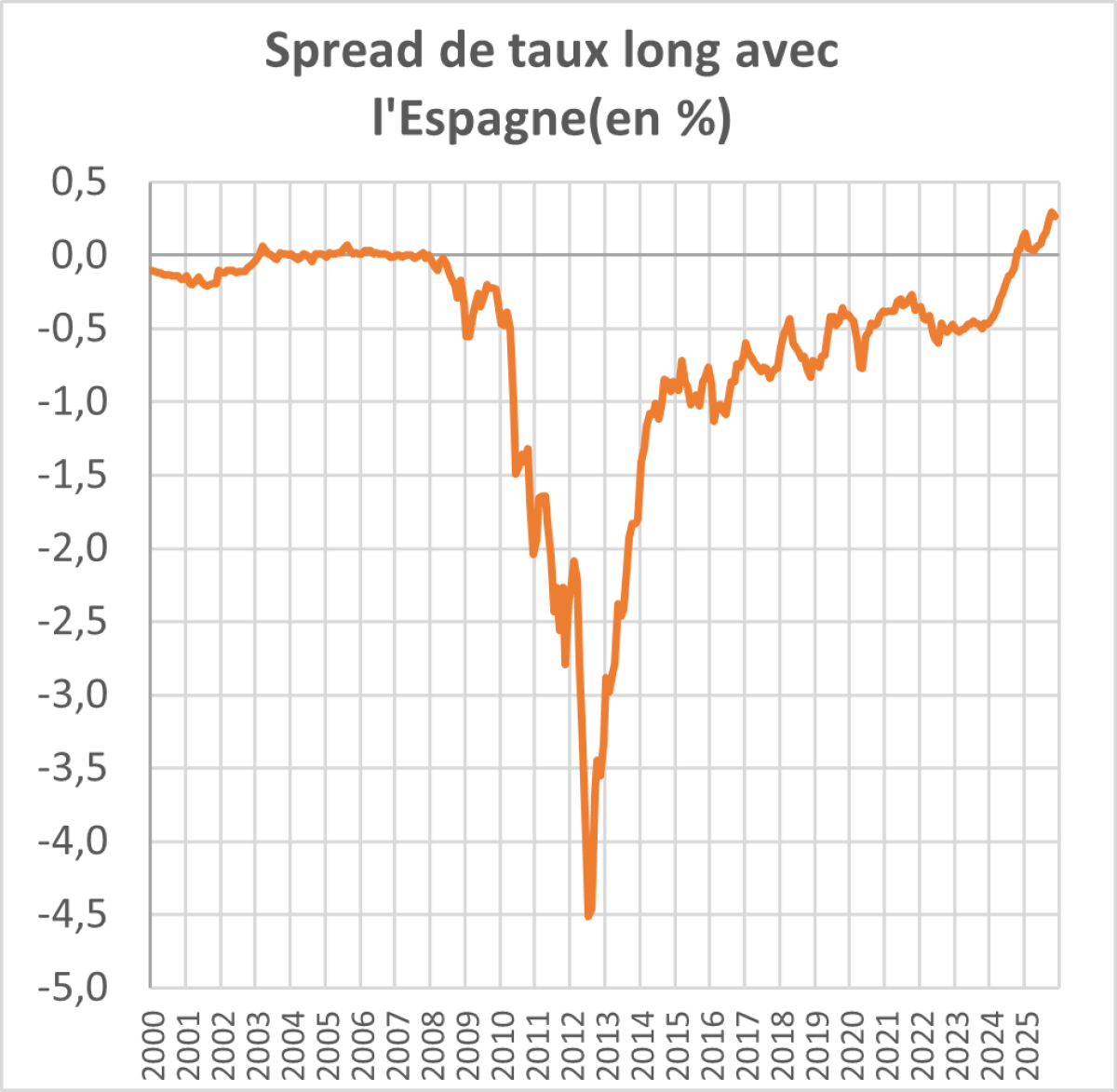Nous constatons une légère tension sur les taux et une progression lente mais régulière du spread entre le taux de rendement des obligations d’Etat françaises à long terme et ceux de tous les autres pays, y compris des pays du sud de l’Europe avec lesquels nous avions traditionnellement un avantage en matière de taux,