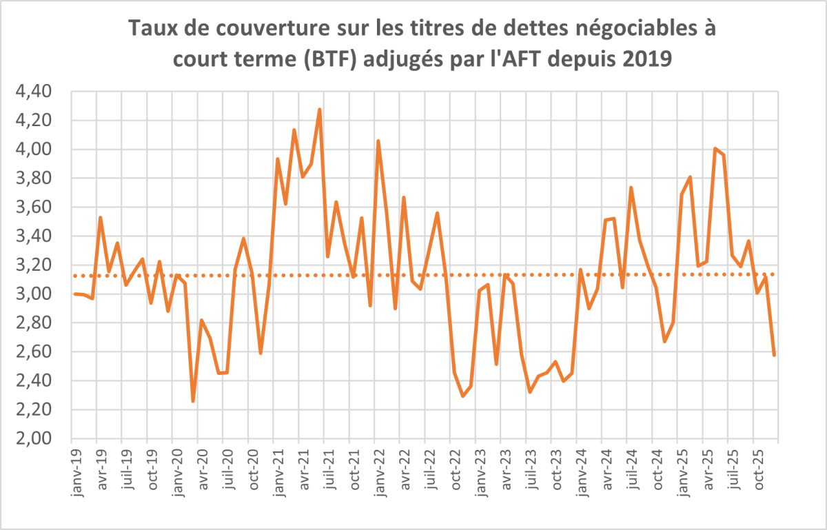 Sur l’ensemble des BTF (échéances de 6n 9 et 12 mois), la tendance du taux de couverture est relativement stable depuis 2019, autour de 3,1. Le taux de couverture était même monté jusqu’à 4 sur les BTF en mai 2025, proche de son plus haut niveau sur les années récentes. Il a depuis assez régulièrement décru pour s’établir en fin d’année à 2,6, désormais proche de ses plus faibles niveaux connus début 2020 ou en 2023. Le taux de couverture est souvent à un niveau faible en début de l’année mais sa remontée devra être surveillée. Si elle ne devait pas advenir, l’AFT aurait quelques difficultés à placer la dette à court terme en substitution partielle de ses émissions à moyen et long terme pour bénéficier de plus faibles taux d’intérêt.