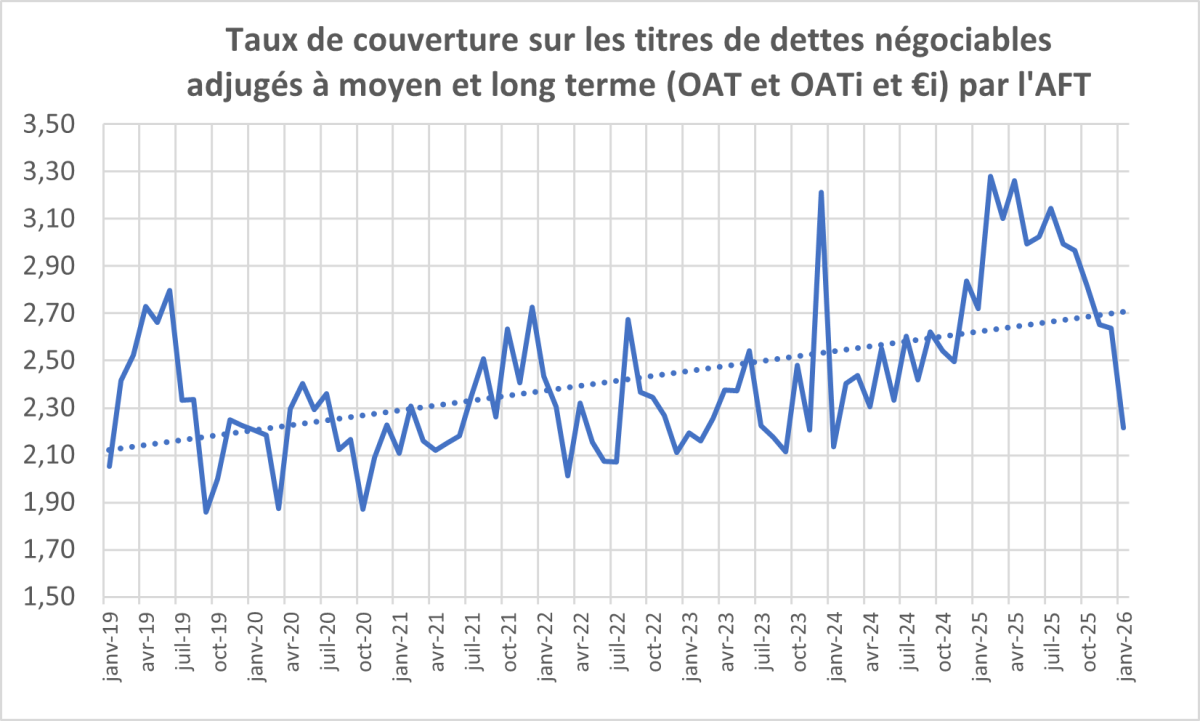 Le taux de couverture sur les obligations à moyen et long terme (indexée ou non) a connu une tendance à la hausse depuis début 2019, passant de 2,1 en janvier 2019 à plus de 3 en avril 2025. Nous constatons cependant, également sur le marché de la dette à moyen et long terme, un écroulement récent du taux de couverture qui s’est établi à 2,6 en décembre 2025 puis 2,2 en janvier 2026 (en attente de l’adjudication de la dette à moyen terme et de la dette indexée du 22 janvier).