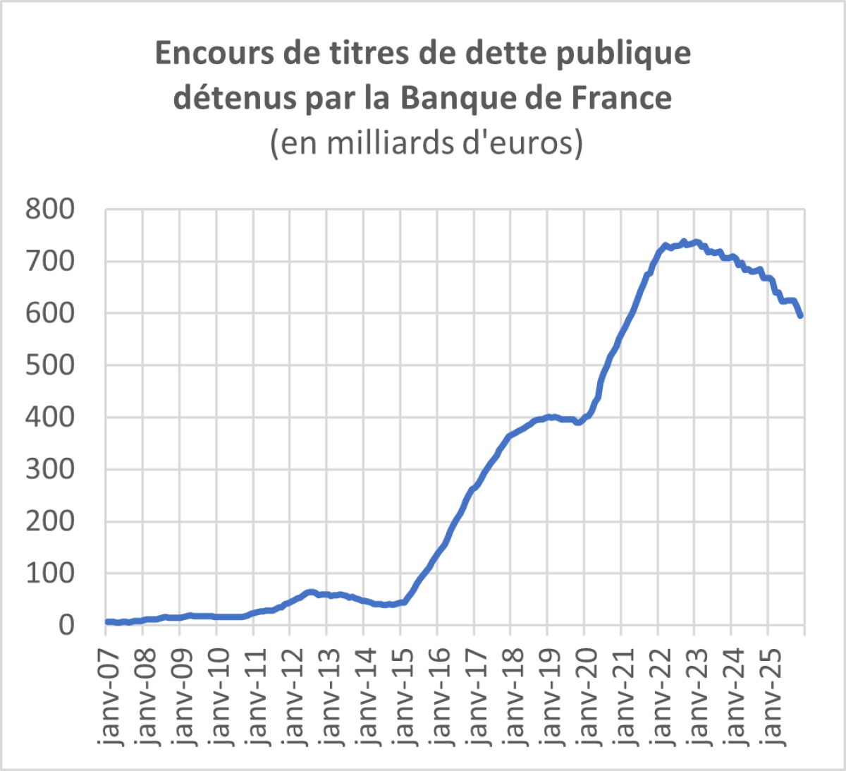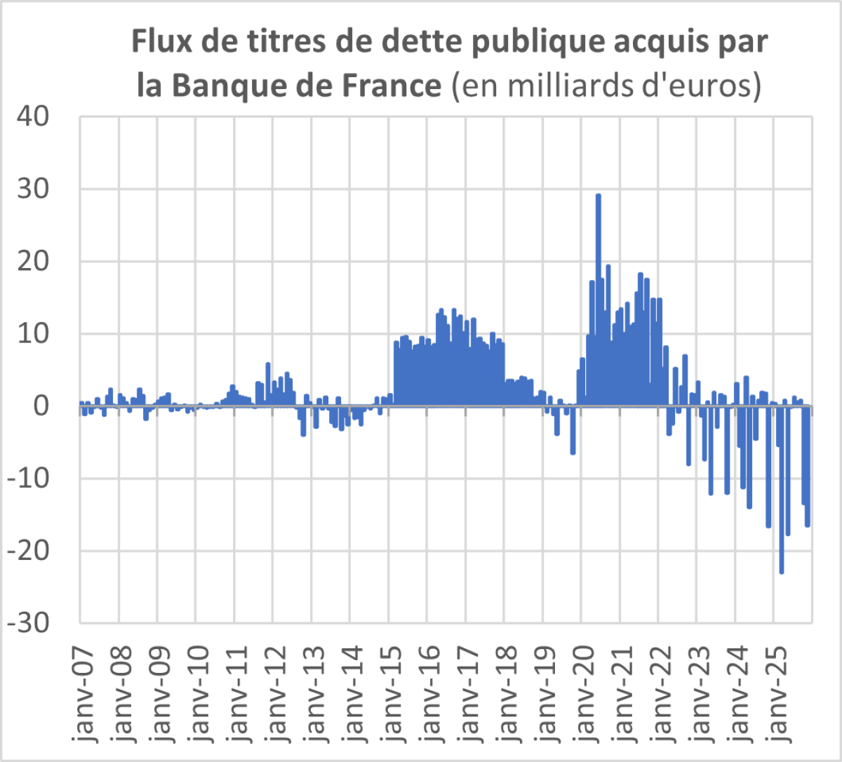Sur le marché secondaire, la Banque de France continue de ne plus renouveler les titres de dette parvenus à échéance. Elle détenait encore 596 milliards de titre de dette publique en novembre 2025 contre 732 milliards d’euros trois ans plus tôt (novembre 2022). La Banque de France se porte donc de moins en moins acquéreuse de titres de dette, n’offrant plus ainsi que garantie de revente aux opérateurs de marché qui détiendraient de la dette française.