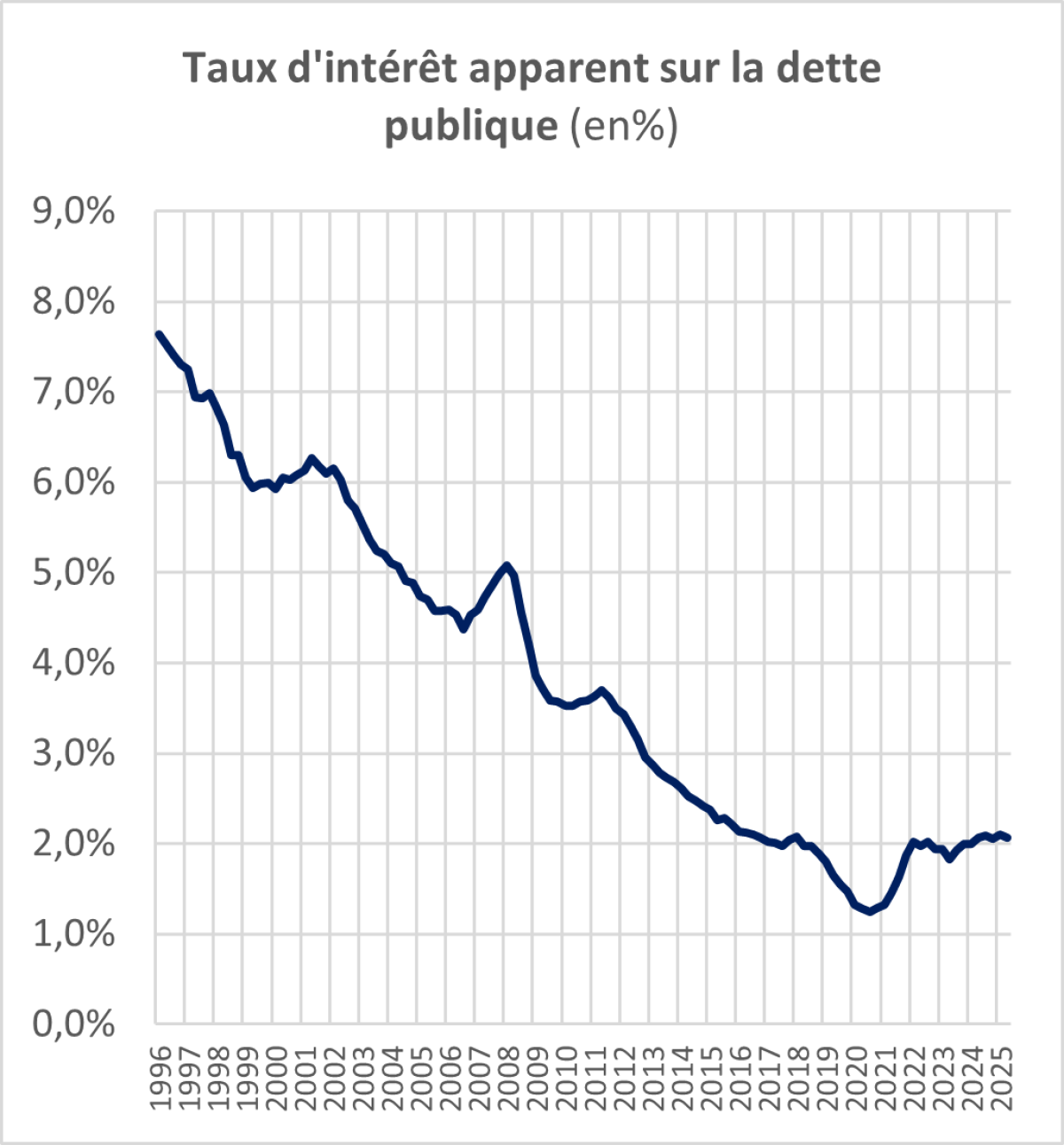 Alors qu’une part croissante de la dette est devenue négociable, à court ou à long terme, majoritairement à long terme, cette situation d’une dette dont le poids ne cessait de croître du fait de déficits récurrents a longtemps été amortie par une tendance à la baisse des intérêts associés à cette dette. Le taux d’intérêt apparent sur la dette publique française a ainsi lentement décliné pendant 25 ans, passant de 7,6 % début 1996 à 1,3 % fin 2020.