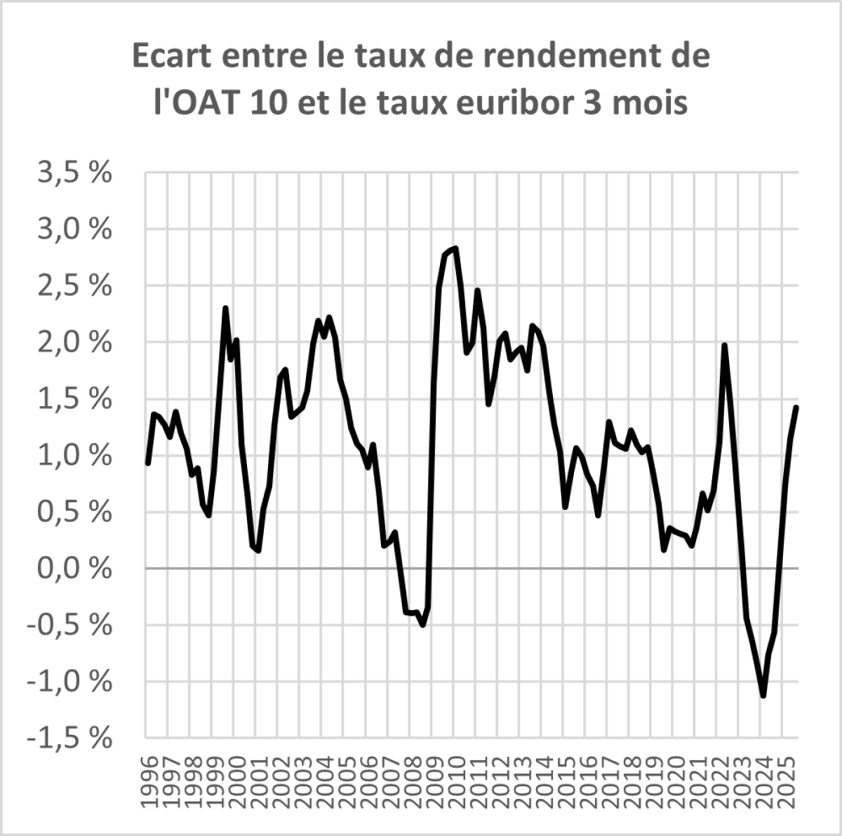 Las ! Le choc inflationniste de 2022 a amené la BCE à sortir d’une longue situation de taux directeurs nuls ou faibles et la repentification de la courbe des taux, autant que la forte demande des Etats partout dans le Monde pour le financement de leur dette ou de leurs investissements de long terme, a amené les taux d’intérêt à long terme à des niveaux proches de ceux du début des années 2000, avant les crises des Subprimes, de la dette souveraine en zone euro et du Covid…. L’écart entre le taux de rendement de l’OAT 10 ans et le taux d’intérêt monétaire euribor 3 mois est désormais de 1,4 %, lorsque sa moyenne sur 30 ans, une sorte de prime de risque, n’a été que très légèrement supérieure à 1 %.