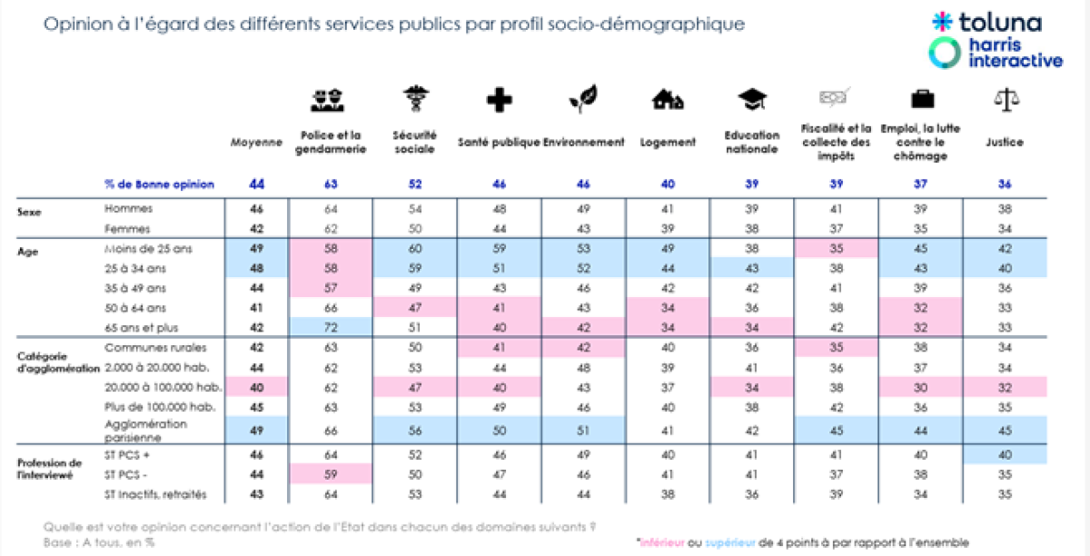 Sans surprise cependant, la Justice et les services de l’emploi ferment la marche mais cette fois-ci à égalité, avec 68 % d’opinions favorables (mais avec seulement 17 % de très favorable pour les services de l’emploi, contre 22 % pour la Justice).
