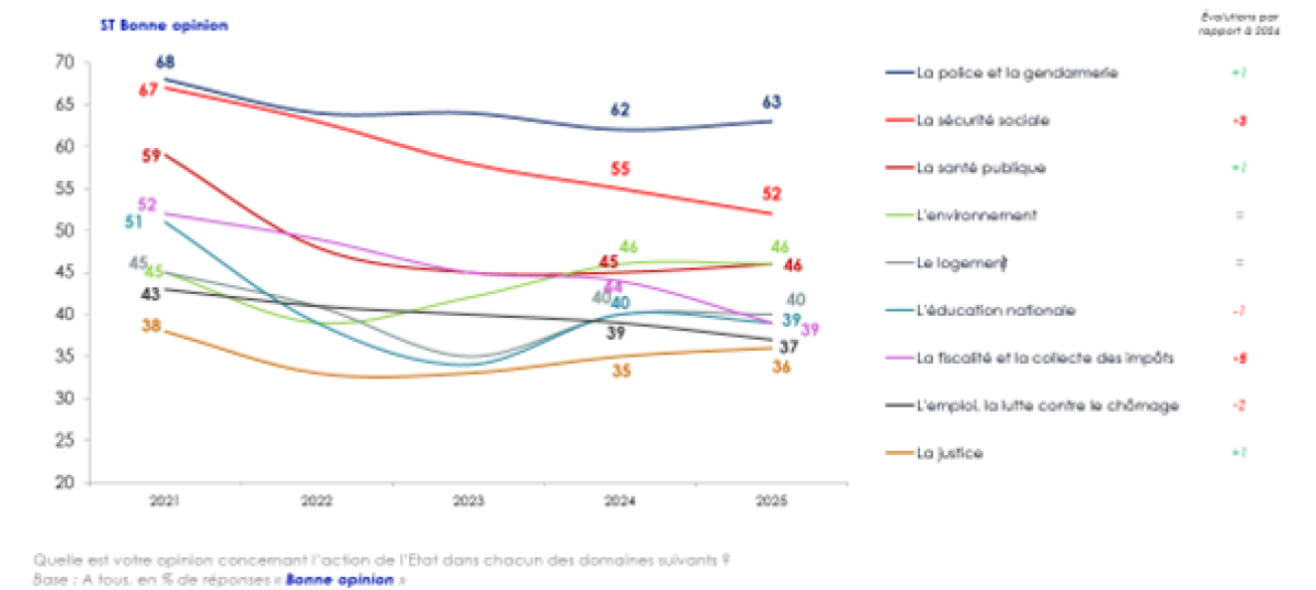 De façon générale, on constate un « décrochage » des opinions favorables depuis 2021, même pour les services publics les plus estimés. La police augmente de 1 point à 63 % d’opinions favorables entre 2024 et 2025, mais « décroche » depuis 2021 où elle bénéficiait de 68 % d’opinions positives (-5 points).