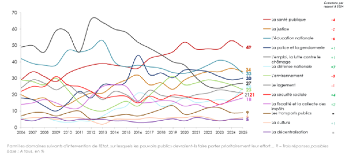La Santé publique apparaît comme la politique publique à prioriser à 49 % (-4 point depuis 1 an), et a remplacé à compter de 2018 l’Emploi, comme service prioritaire des Français. Ce dernier n’est plus que 5ème service à renforcer avec 27 % d’opinion favorable pour le prioriser. En revanche, la Justice arrivée dernière et ex-equo en matière d’opinions favorables et d’expérience favorable des usagers, arrive désormais 2ème comme la politique à prioriser, ce qui montre bien la perception véritable d’une politique « sous-dotée » budgétairement par l’opinion. Le décrochage scolaire est également parfaitement perçu et arrive en 3ème positions des politiques à renforcer prioritairement (33 % d’opinion favorable), devant les dotations des forces de sécurité intérieure (30 %, +1 point par rapport à 2024).