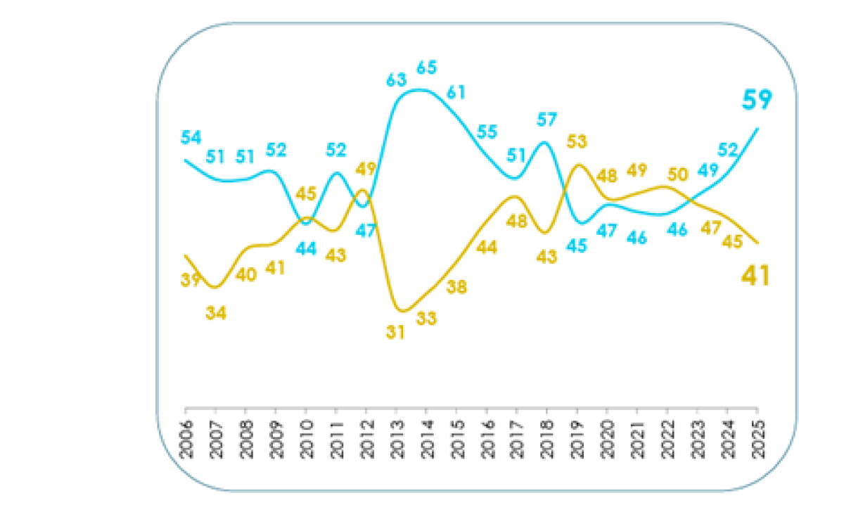La chute est encore plus brutale pour la Sécurité sociale qui passe de 68 % d’opinions positives à 52 % soit -16 points en 5 ans. A l’autre bout du nuancier des services publics, la Justice est constamment la plus basse depuis 2021 (-2 points) à 36 %, tandis que les services de l’emploi et de la lutte contre le chômage décrochent également, passant de 43 % en 2021 à 37 % en 2025, soit -6 point en 5 ans, et ce, malgré la baisse du taux de chômage. En réalité, le croisement des courbes des services de l’emploi et de ceux de la justice date de 2020. Auparavant, l’opinion porté sur les services de l’emploi était beaucoup plus basse, tutoyant les 10 % d’opinons favorables en 2014. Rappelons qu’en 2011, la Justice bénéficiait de près de 47 % d’opinions favorables. La dégradation de son image en 16 ans est de près de 11 points.