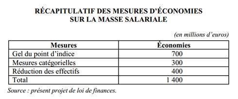 Le tome 1 du rapport de Mme Valérie Rabault, apporte les éléments complémentaires suivants [4] : « Le présent projet de loi de finances prévoit la poursuite de l'augmentation en euros courants des dépenses de la masse salariale (+478 millions d'euros, soit une augmentation de 0,6%) mais à un rythme inférieur à celui de l'inflation (+720 millions d'euros)… » Les 1,4 milliard d'euros d'économies dégagées par rapport au tendanciel de 1,9 milliard permettant de retrouver les +478 millions d'euros d'augmentation de la masse salariale.