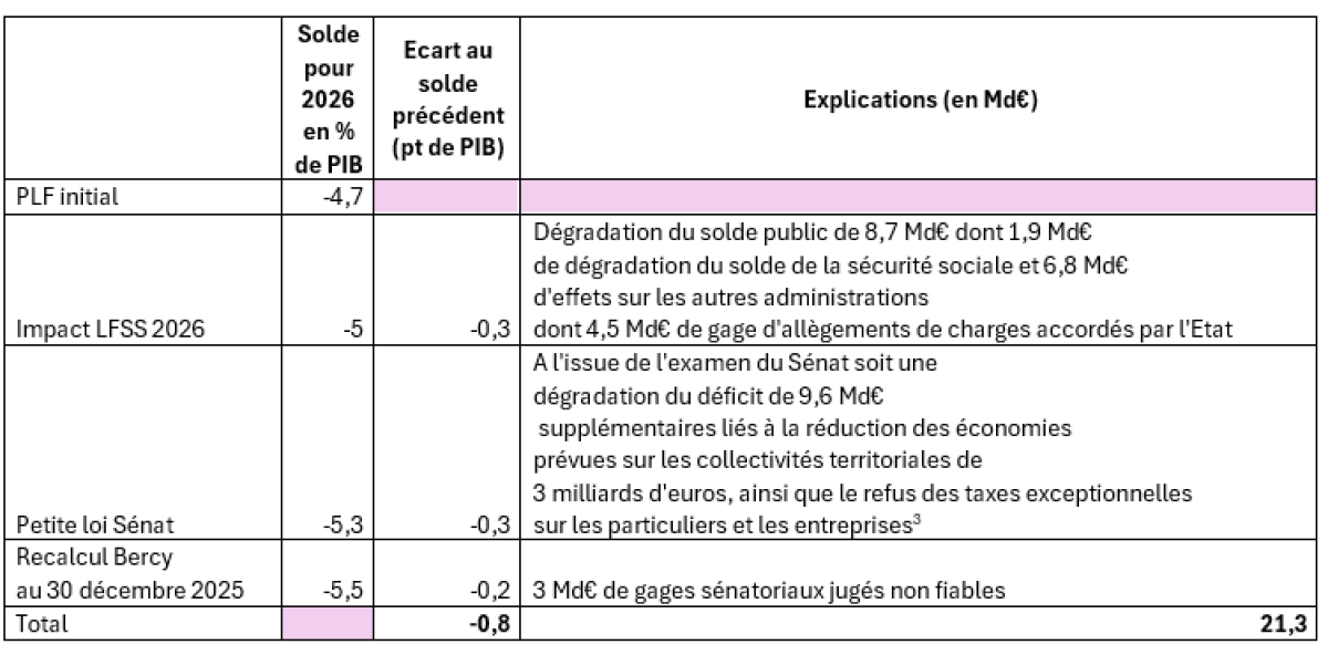 Lors de la réunion survenue à Bercy le 6 janvier entre les Ministres chargés de l’économie, des finances et des comptes publics et les parlementaires, les services de Bercy ont fait savoir que le déficit public pour 2026 frôlait désormais les -5,5 % du PIB à l’issue de l’arrêt provisoire des travaux parlementaires au 31 décembre 2025[1]. Soit une nette dégradation par rapport au solde public de la « petite loi » suite à l’adoption du budget 2026 au Sénat à -5,3 % du PIB[2].