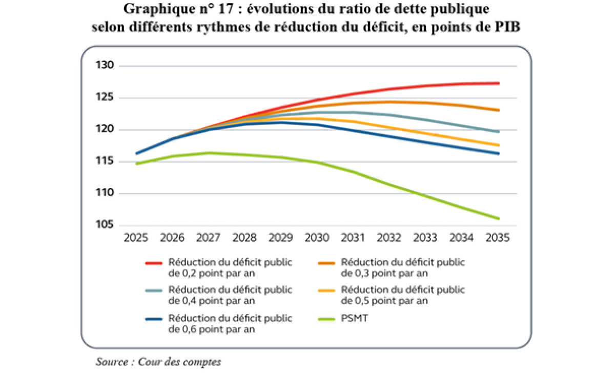 « Il est désormais indispensable », affirme la Cour, « d’atteindre cette nouvelle cible de 5,0 points de PIB en 2026 [de déficit ndlr] et d’accentuer les efforts au cours des années suivantes, afin de ne pas accumuler davantage de retard et de conserver une chance de stabiliser le ratio de dette publique d’ici la fin de la décennie ».