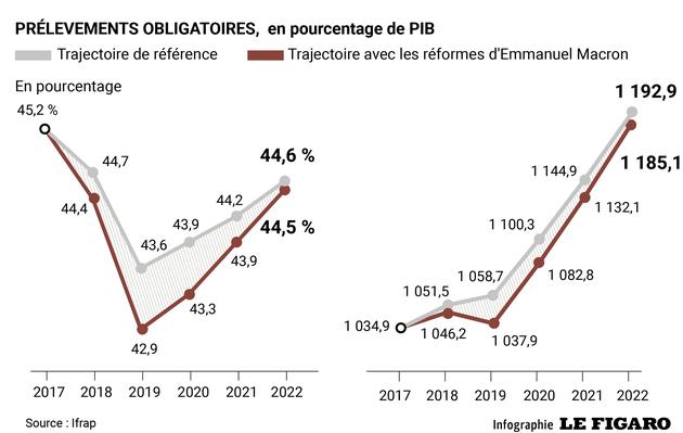- Même chose sur le poids des prélèvements obligatoires : nous sommes aujourd’hui à 45% du PIB (contre 40% en moyenne en Europe). Le gouvernement espère atteindre 43,3% d’ici 2022… contre 44% d’après notre modélisation.
