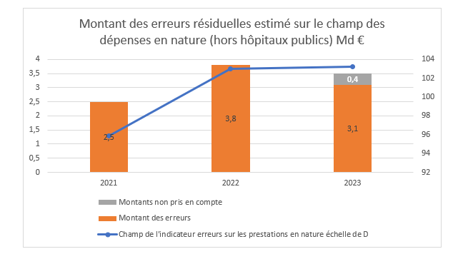Pour les prestations en nature délivrées, le champ de l’échantillon considéré exclut les séjours dans les hôpitaux publics pour des raisons non définies. Or les extrapolations sur 2.640 dossiers considérés montrent un aux d’erreur de 8,3%, en hausse de 0,2 point par rapport à 2022. Et les montants sont considérables, soit 3,1 milliards d’euros en 2023.Pourtant certaines erreurs ne sont pas prises en comptes (absences de pièces justificatives, droits qui auraient dus être fermés, prises en charges sur feuille de soins non signée etc.) soit +0,4 milliard d’euros :