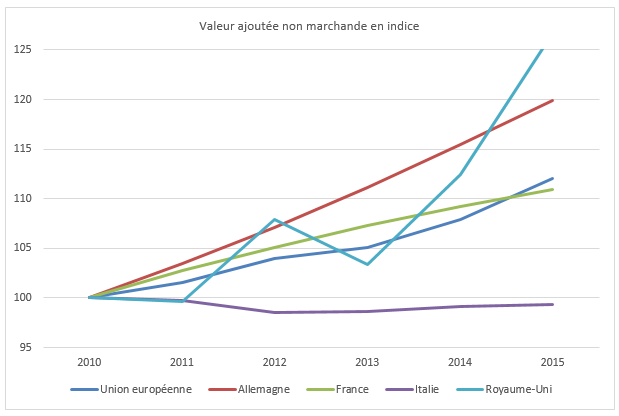 Les indicateurs de l’activité non marchande ont été comparés entre la France, l’UE (28 pays), l’Allemagne, l’Italie, le Royaume-Uni.