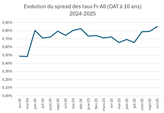 Si on se penche sur l’évolution du spread depuis avril 2024, on constate une explosion du spread avec l’annonce de la dissolution début juin 2024. Entre mai et juin 2024, le spread augmente de 40 points de base. L’instabilité politique a créé un nouveau plateau du spread des taux bien plus haut qu’avant la dissolution. La démission de Sébastien Lecornu en octobre 2025 semble faire monter le spread encore plus haut, et la menace d’une nouvelle dissolution laisse penser qu'il pourrait encore augmenter vers des niveaux historiquement hauts.