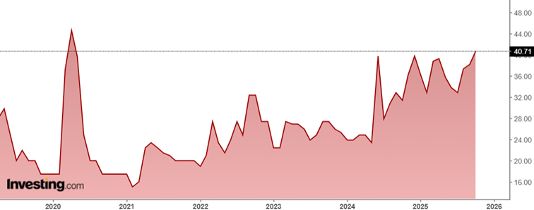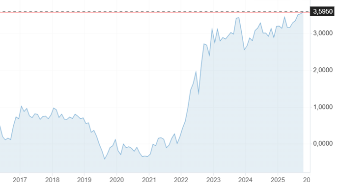 Depuis 2017, le spread des taux à la clôture des marchés financiers augmente fortement. Entre 2017 et 2020, il semblait pourtant se réduire légèrement, avec des déficits contrôlés qui ne dépassaient pas les 3 % du traité de Maastricht. La crise Covid a ensuite fait monter le spread jusqu’à un plateau plus élevé autour des 50 – 60 pb entre 2022 et début 2024. On constate ensuite une nouvelle hausse à partir de mi-2024 qui amène le spread à des niveaux inédits depuis la crise des dettes souveraines, avec des pics jusqu’à 80-89 pb. La tendance générale depuis 2017 est donc clairement à la hausse : le spread des taux a plus que doublé depuis 2017.