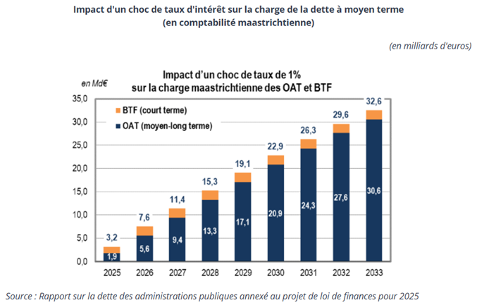 Les estimations de l’Agence France Trésor de 2024 sont édifiantes. L’AFT estimait en effet qu’un choc de taux pérenne de 1 % par rapport au scénario envisagé entraînerait une hausse de la charge de la dette de 3,2 Mds € à 1 an, 19,1 Mds € à 5 ans et 32,6 Mds € à 9 ans. Les perspectives d’instabilité politique à venir, avec une potentielle nouvelle censure de gouvernement ou dissolution, sont donc particulièrement préoccupantes.