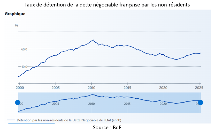 Entre 2000 et 2010, le taux de détention de dette négociable par les non-résidents a explosé. De 28,6 % en 2000, il a grimpé jusqu’à 70 % en 2010. Ce taux n’est donc pas au plus haut historique au T2 2025 (55,4 %), mais la hausse reprend très rapidement puisqu’il était de 48,1 % en 2022. Le recul du taux de détention de la dette par les non-résidents entre 2010 et 2022 s’explique en réalité par le programme de rachat massif de titres par l’Eurosystème (BCE, et banques centrales nationales de la zone euro) pour faire face à la crise des dettes souveraines puis à la crise Covid. En valeur depuis 2009, l’encours de dette négociable détenue par les non-résidents a tout de même augmenté de 113 %.
