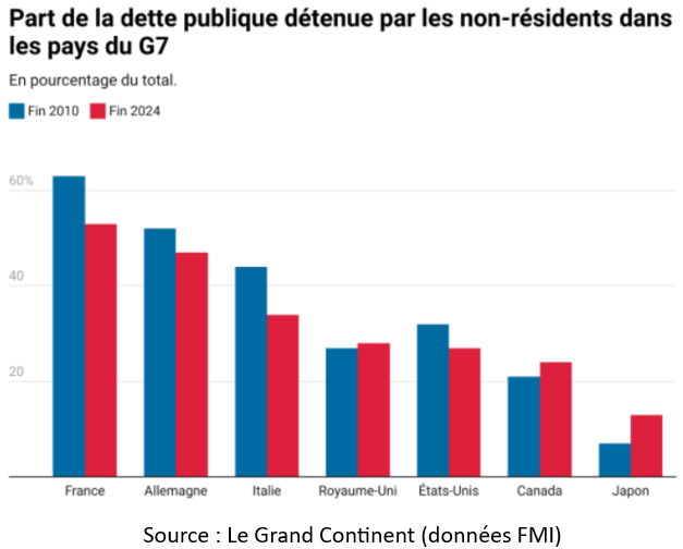 Ainsi, il n’est pas souhaitable de réduire à 0 % la part de la dette détenue par les non-résidents. Toutefois, quand cette part devient trop importante, comme en France aujourd’hui, la détention des titres souverains par des non-résidents peut présenter des inconvénients. Il est le signe d’une perte de souveraineté de la France sur sa gestion de la dette. C’est un élément de risque dans les périodes de tensions sur les marchés des emprunts publics puisque les investisseurs non-résidents seront plus enclins à des revirements soudains. Le biais domestique (la tendance qui pousse les investisseurs à privilégier les actifs financiers de leur propre pays) s’accroît durant ces périodes de tensions du marché obligataire. C’est précisément ce qu’il s’est passé durant la crise des dettes souveraines dans les années 2010 dans la zone euro. Les investisseurs non-résidents ont vendu massivement leurs titres souverains étrangers pour acheter des titres de dette nationaux. Ces retraits ont aggravé les tensions sur les taux dans des pays déjà en difficulté (Grèce, Portugal, Espagne, Italie…).