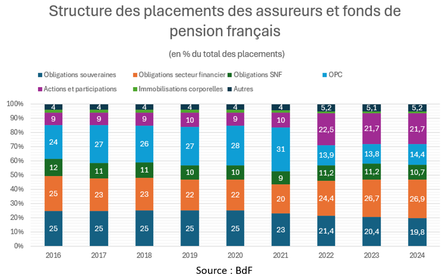 Si la part de la dette détenue par les assureurs français a chuté, c’est en grande partie parce que la part des obligations souveraines dans l’ensemble des placements des assureurs a chuté. Les obligations souveraines représentaient 25 % des placements des assureurs et fonds de pension français en 2016, contre 19,8 % en 2024. Depuis 2016, les investissements se sont davantage tournés vers les obligations du secteur financier et les actions et OPC, particulièrement depuis 2022.