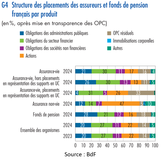 En 2024, les obligations souveraines françaises représentaient 12 % des placements des assurances et fonds de pension. Ce taux varie entre 11 et 19% depuis 2016, avec une tendance à la baisse pour plusieurs raisons.