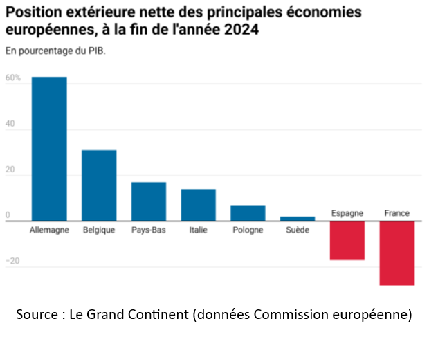 Plutôt que diriger l’épargne vers la dette, il faudrait améliorer la compétitivité de l’économie française pour réduire la dépendance du pays vis-à-vis des investisseurs non-résidents. La priorité est donc de réduire nos besoins de financements externes en rééquilibrant nos échanges extérieurs et notre position extérieure nette qui est aujourd’hui largement négative. La position extérieure nette de la France vis-à-vis du reste du monde (actifs moins passifs) est négative (- 28 % du PIB) alors que celle des principaux pays de l'Union européenne est souvent positive (+ 63 % du PIB pour l'Allemagne et + 14 % pour l'Italie).