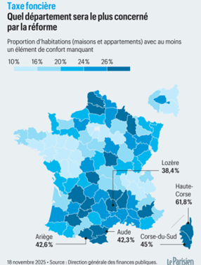 [2] Très précisément, pour les locaux des particuliers, la loi de finances pour 2020, via son article 146, avait prévu une révision des valeurs locatives en 2026 mais le budget 2023 l'a reportée à 2028. Le projet de loi de finances pour 2026 diffère encore cette échéance, de trois ans, à 2031. Par ailleurs s’agissant des locaux professionnels, cette actualisation serait reportée de 2026 (loi de finances pour 2024) à 2027 (loi de finances pour 2026), accompagné d’un dispositif de lissage des cotisations de fiscalité locales des locaux professionnels pendant 6 ans.
