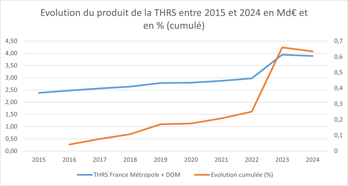 Notons par ailleurs pour la simple THRS depuis 2015, son rendement a été multiplié par près de 63,5% d’après la DGFiP (métropole + DOM). Elle atteint ainsi 3,89 Md€ en 2024 contre 2,4 Md€ en 2015[12].