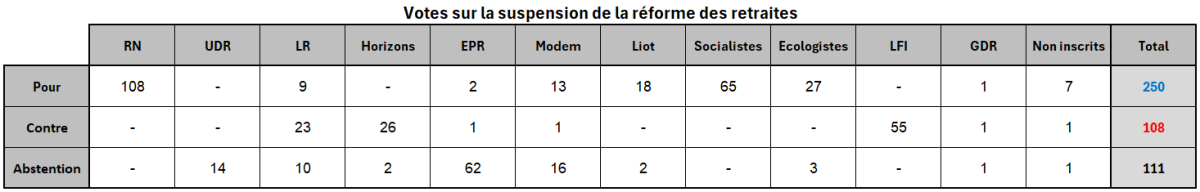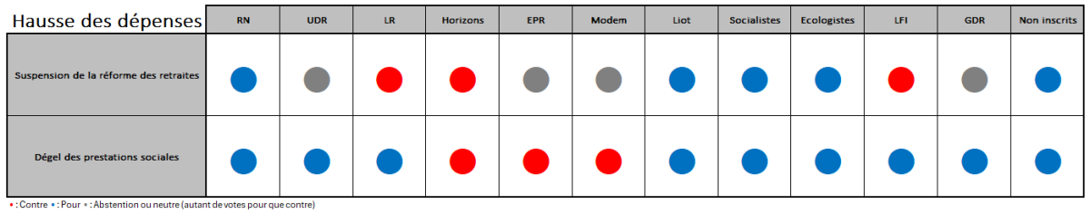 Les députés ont voté toutes ces hausses d'impôt pour financer le détricotage des mesures d'économies sur les dépenses, surtout de la Sécurité Sociale. Les deux mesures phares de hausse des dépenses par rapport au budget initialement présenté par le gouvernement sont la suspension de la réforme des retraites et le dégel des prestations sociales. Qui a voté ces dépenses supplémentaires ?