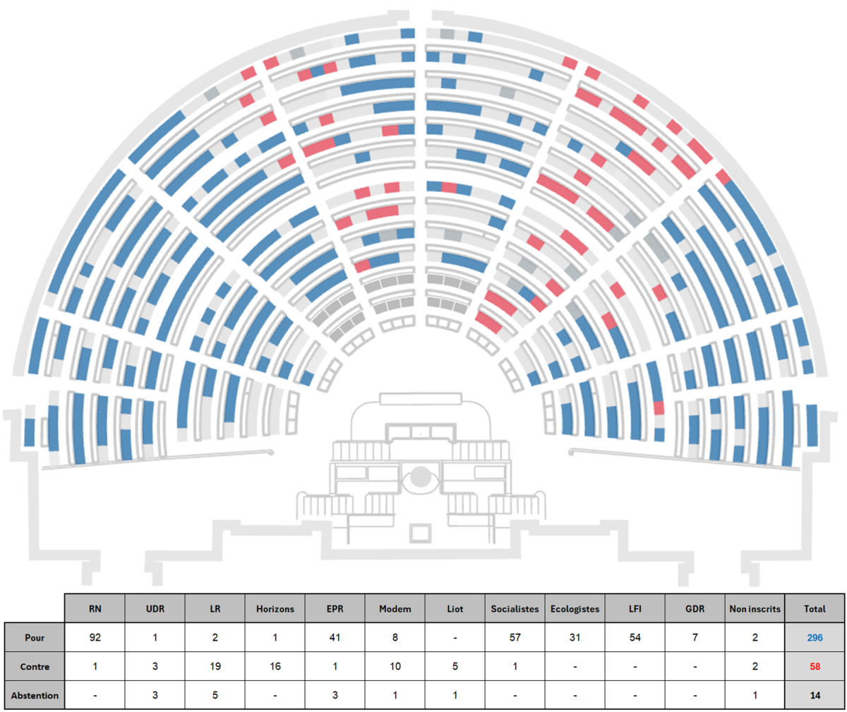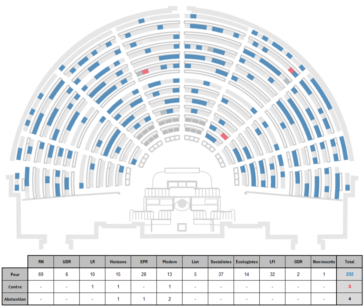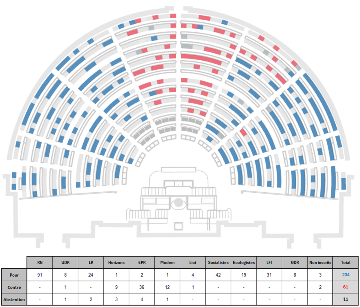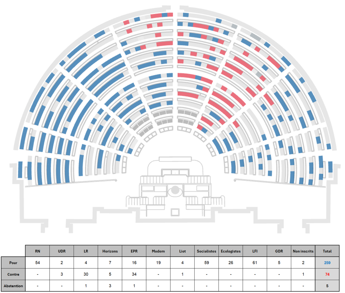 Il a été adopté grâce aux votes des groupes EPR, Horizons, LR, UDR et RN.
