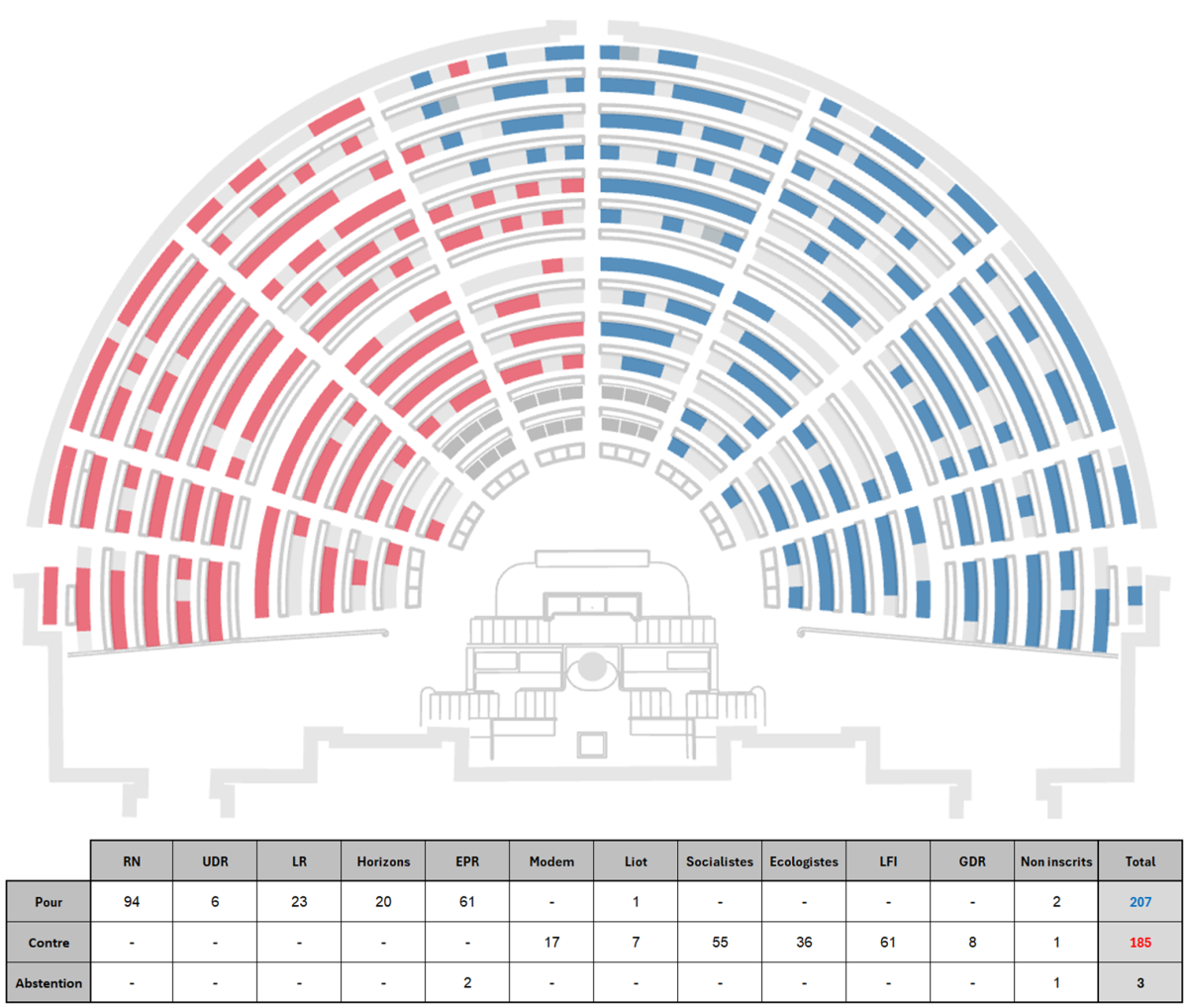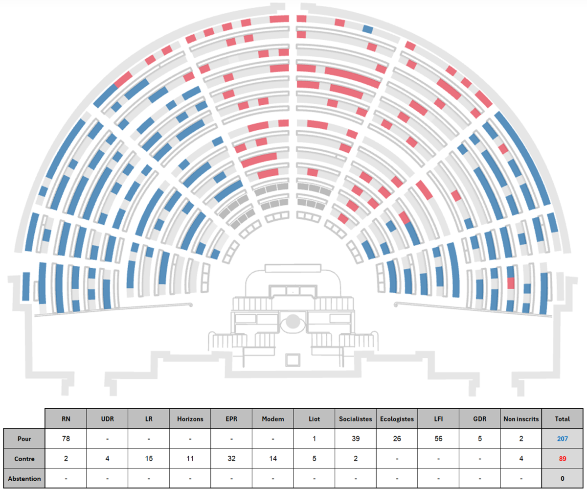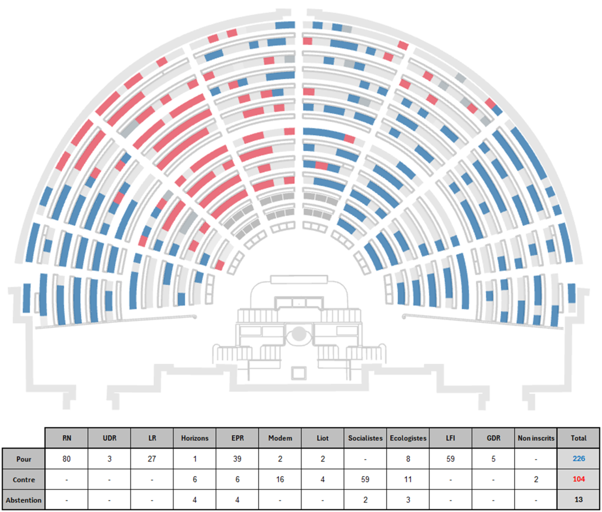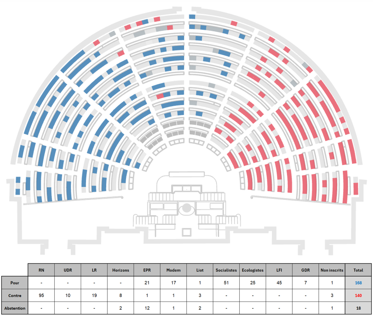 Il a été adopté grâce aux votes des groupes EPR, Horizons, LR, UDR et RN.