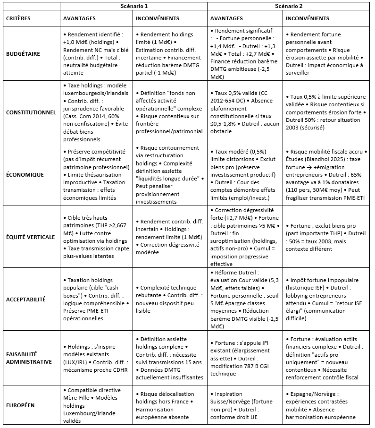 Au surplus dans le scénario n°1 le CPO reste très évasif sur le rendement de sa contribution différentielle sur l’héritage, alors qu’il s’agit du point le plus sensible pour les hauts patrimoines, tandis que le scénario n°2 se caractérise par la mise en place d’une Exit Tax renforcée (10 ans post-expatriation), un renforcement de la coopération internationale afin de limiter l’évasion fiscale créée par ce « big bang fiscal » d’un retour de l’ISF gagé par une baisse des DMTG sur les classes moyennes.