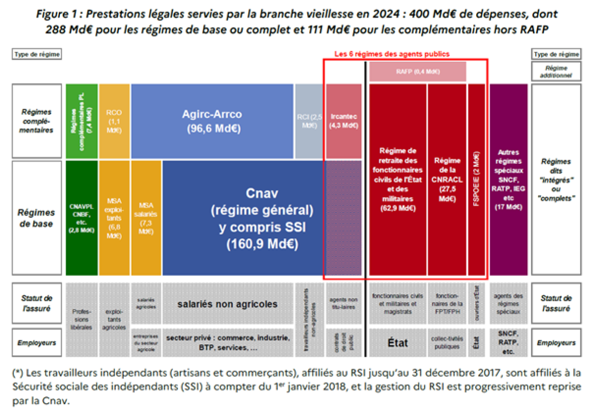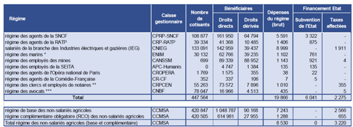 Au total, ces 5 régimes représentent 97 milliards de dépenses. Les trois régimes de retraite des fonctionnaires (FPE, CNRACL, FSPOE) sont des régimes complets (ou « intégrés » car non associés à un régime complémentaire). Ils représentent 32 % des dépenses de l’ensemble des régimes de base pour près de 16 % du nombre de pensions servies, et 14 % de l’ensemble des cotisants.