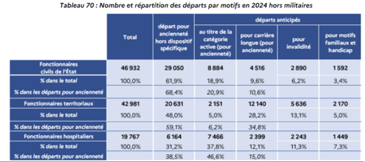 On compte 47 000 départs en retraite de fonctionnaires civils en 2024, 43 000 de fonctionnaires locaux et 19 800 de fonctionnaires hospitaliers. Les départs d'agents de catégorie active représentent 19 % des départs dans la fonction publique d’Etat, 38 % dans la fonction publique hospitalière et 5% dans la fonction publique territoriale. A cela s’ajoutent les départs anticipés pour carrière longue qui concernent un grand nombre d’agents (10 % des départs pour les fonctionnaires civils de l’État, 12 % pour les fonctionnaires hospitaliers, 28 % pour les fonctionnaires territoriaux). Au global, 62 % des agents de la FPE et 48 % des agents de la FPT liquident dans les conditions de droit commun, cette part étant de seulement 31 % dans la FPH.