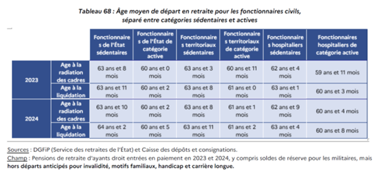 Cela s’explique par l’existence d’âges d’ouverture des droits anticipés pour certaines catégories de fonctionnaires : ceux classés en catégorie active, qui ont accompli au moins 17 ans de services dans un emploi classé comme tel, et qui ont droit à un départ anticipé de 5, voire 10 ans. Pour les fonctionnaires dits « sédentaires » des trois fonctions publiques, qui ne remplissent pas les conditions de la catégorie active, l’âge de radiation des cadres atteint 63 ans et 8 mois.