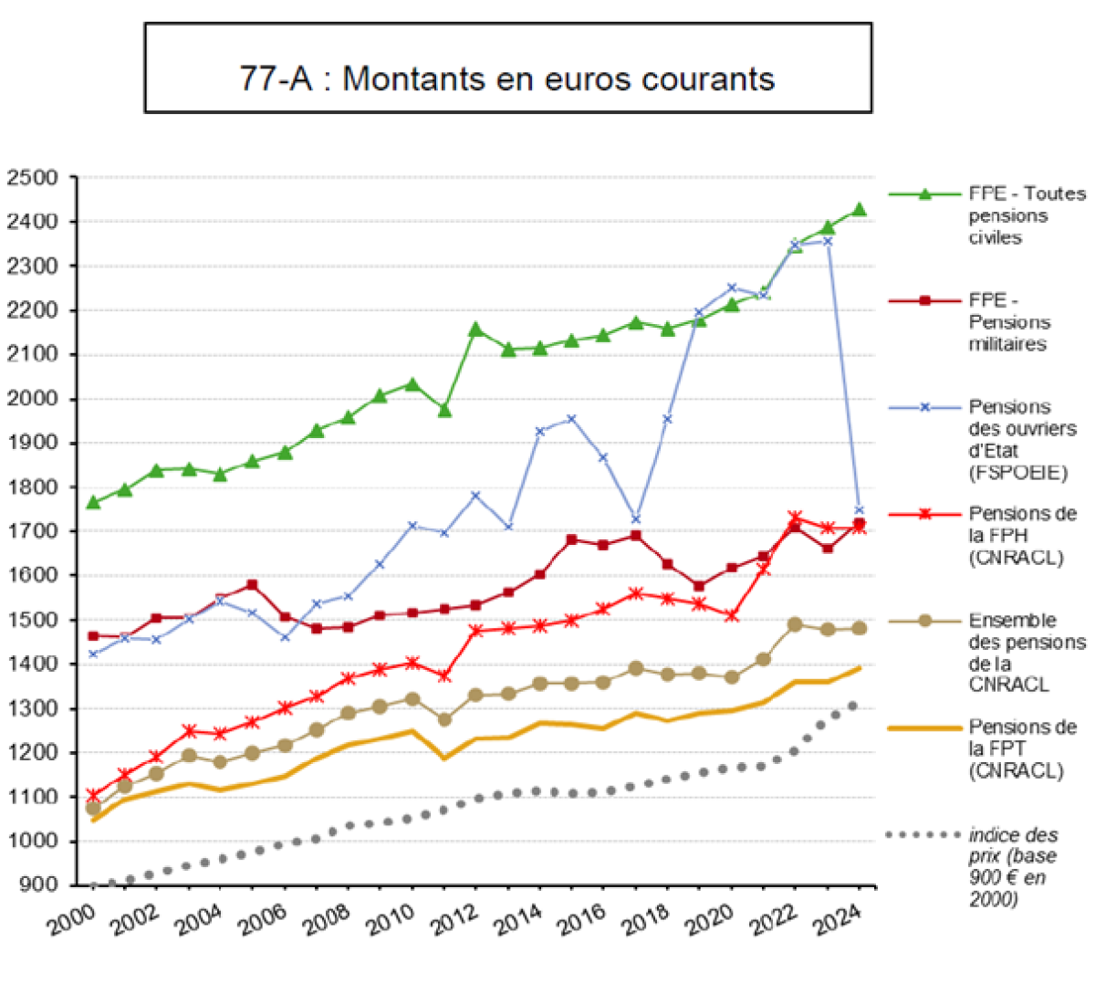 La pension moyenne des nouveaux retraités est supérieure à la pension moyenne du stock de retraités. En 2024, la pension mensuelle moyenne brute du stock des pensionnés est de 2 202 € pour un fonctionnaire d’Etat, 1 625 € pour un militaire, 1 341 € pour un fonctionnaire territorial et 1 580 € pour un fonctionnaire hospitalier.